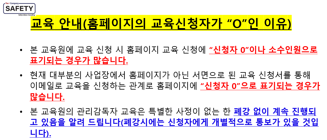 관리감독자 특별안전교육 집체교육 신청. 온라인으로 간편하게 신청하세요.