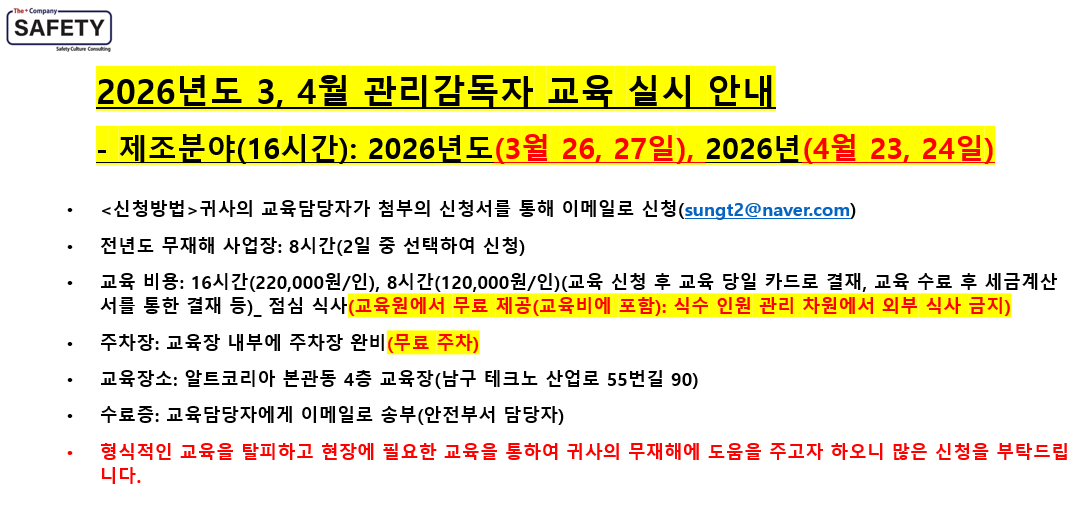 안전보건 직무 향상 과정(관리감독자/안전관리자/SHETeram, 근로자 등)